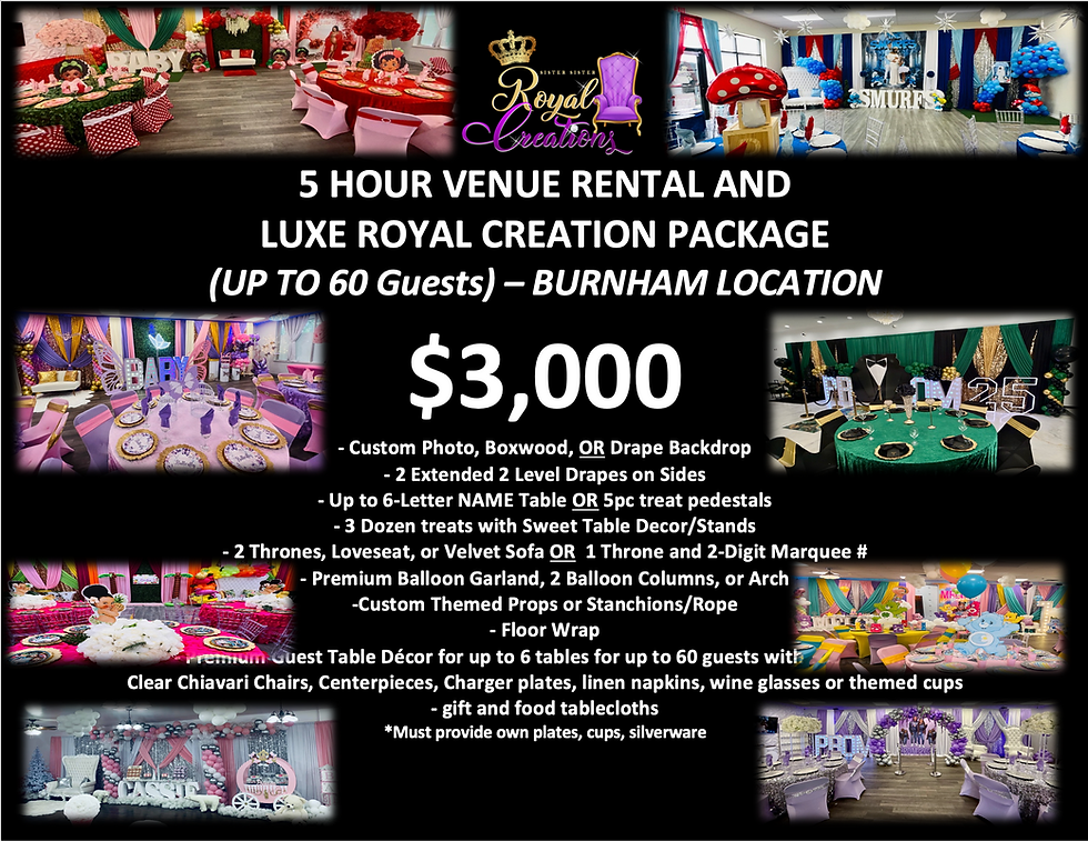 A minimum of 5hrs are required for wedding decor setup or for events with over 100 guest, to ensure that all details are completed by event start time. If 5hrs are not provided we are not responsible for any incomplete/missing decor and NO REFUND will be issued.
